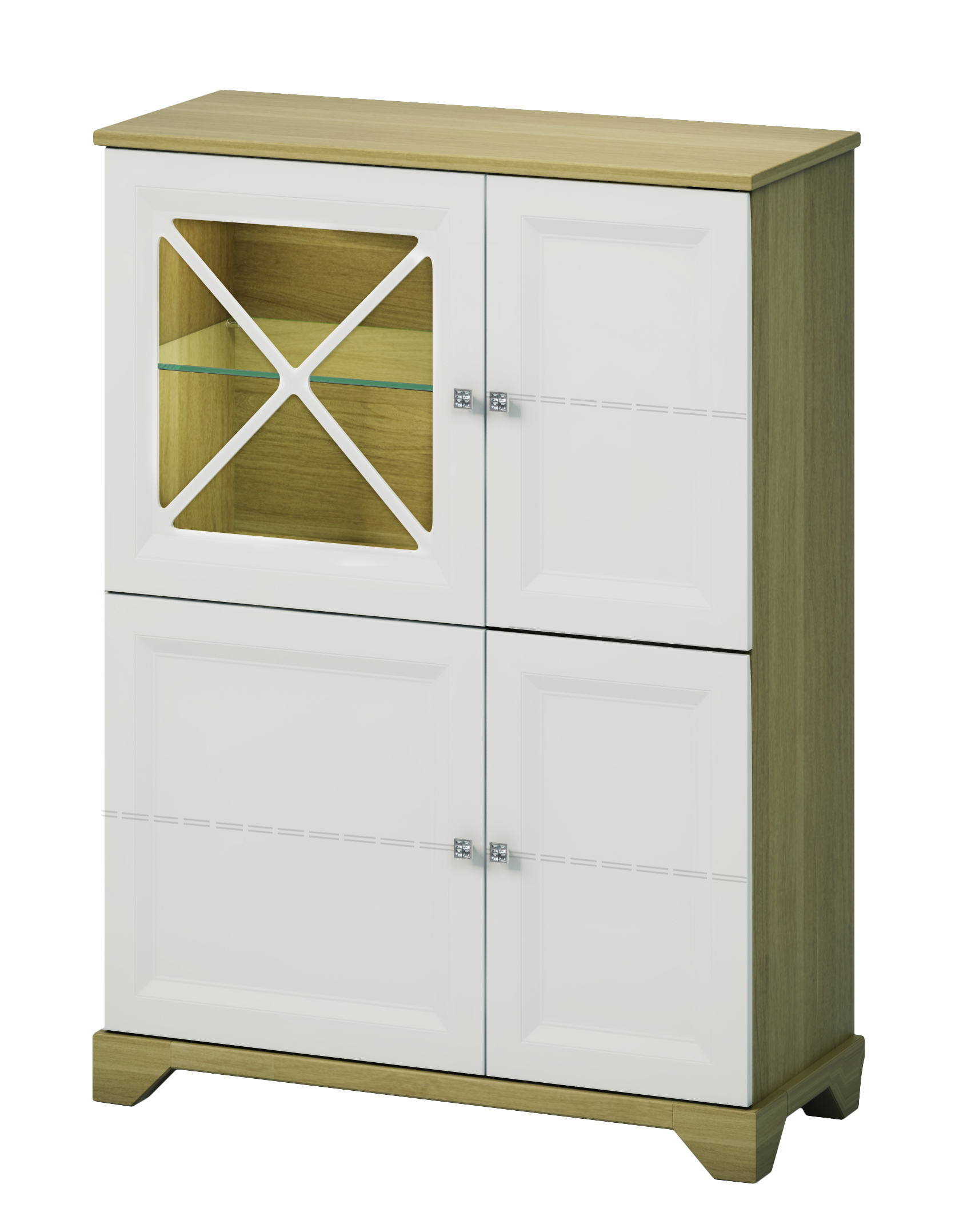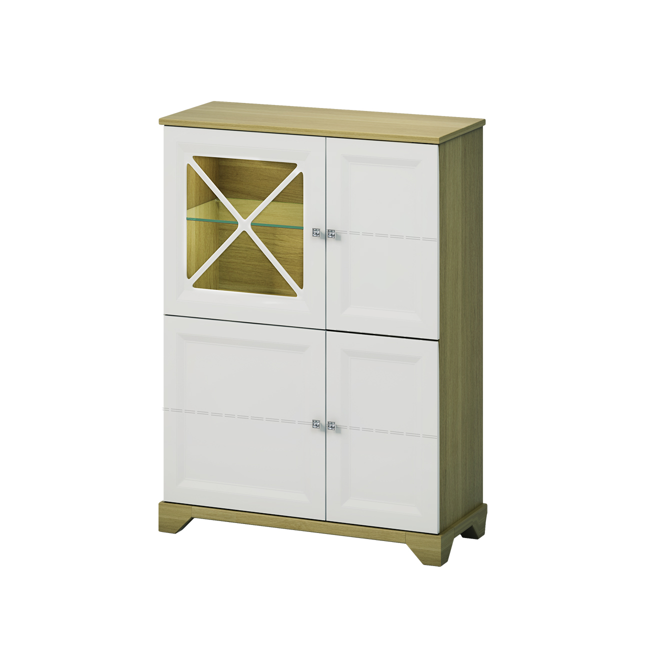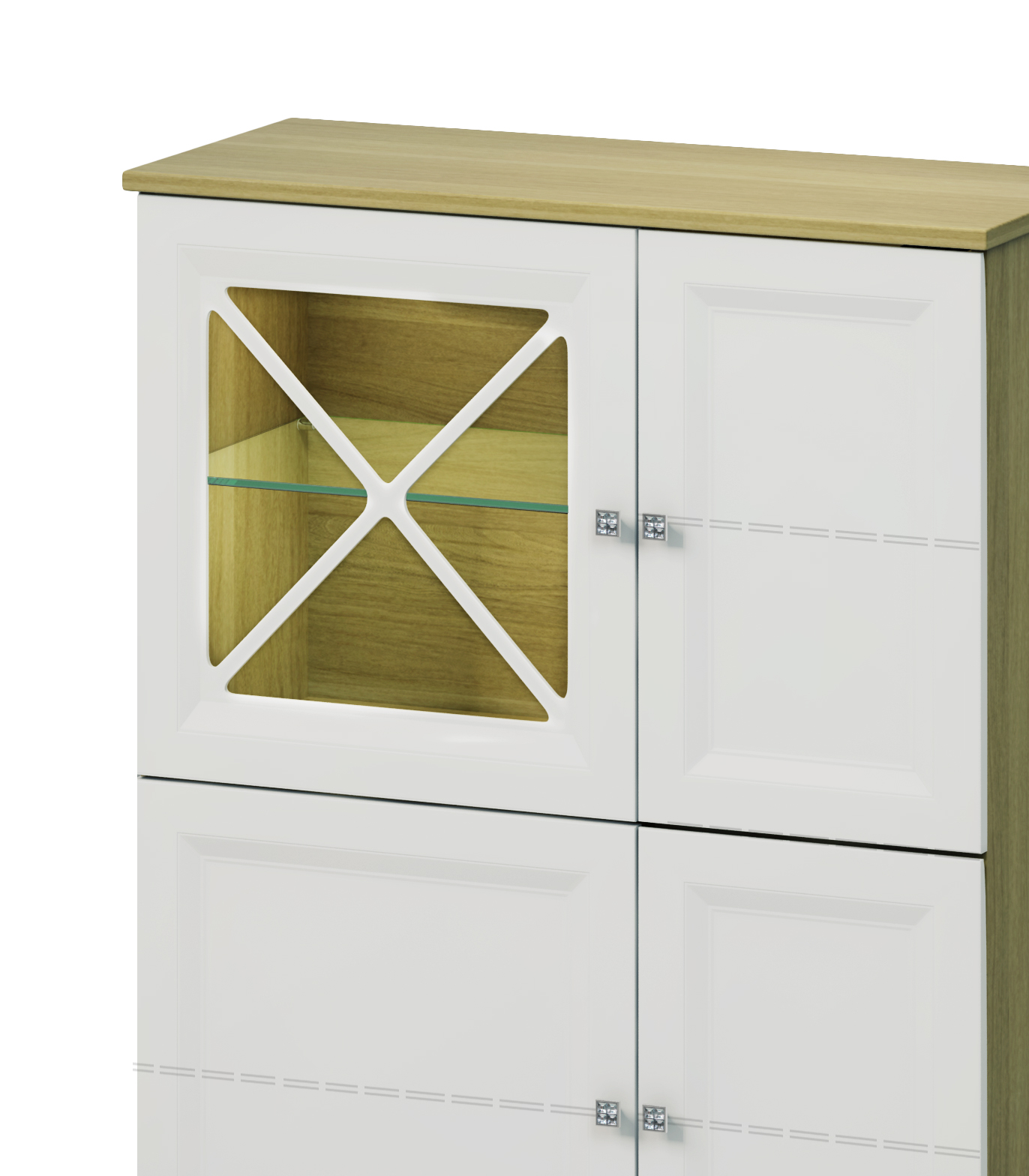 The always fashionable white contrasts here with the body in the color of noble oak. This combination will certainly appeal to lovers of scandinavian aesthetics that are very fashionable nowadays. It is worth adding that both stylish milling and decorated handles are an element that tastefully distinguishes the Verona collection. The glamor style handles will surely add elegance to the interior. In addition, the collection of display cases is decorated with slats that refer to the rustic convention in an interesting way. Importantly, the equipment of Werona furniture includes the highest quality hinges and guides, which significantly affect the comfort of their use. The appropriate design also plays an important role here, thanks to which the collection is characterized by a large amount of space for convenient storage. Glazed shelves with backlight allow you to display your favorite trinkets, tableware or photos, and the soft light creates a unique atmosphere in the evening. High-quality materials and precise workmanship guarantee satisfaction with the Werona collection for many years.