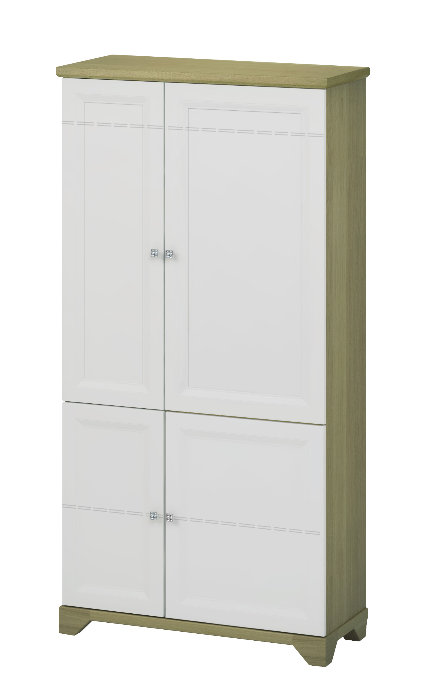Zawsze modna biel kontrastuje tutaj z korpusem w kolorze szlachetnego dębu. Takie połączenie z pewnością spodoba się także miłośnikom bardzo modnej obecnie estetyki skandynawskiej.  Warto dodać, że zarówno stylowe frezowania, jak i zdobione uchwyty są  elementem, który w gustowny sposób wyróżnia kolekcję Werona. Owe uchwyty w stylu glamour z pewnością nadadzą wnętrzu niebywałej elegancji. Dodatkowo, kolekcję witryn ozdabiają listwy, które w ciekawy sposób nawiązują do konwencji rustykalnej. Co ważne, wyposażenie mebli Werona obejmuje najwyższej jakości zawiasy i prowadnice, które znacząco wpływają na komfort ich użytkowania. Ważną rolę gra tutaj również odpowiedni projekt, dzięki któremu kolekcja charakteryzuje się bardzo dużą ilością miejsca do wygodnego przechowywania. Przeszklone półki z podświetleniem pozwalają na ekspozycję ulubionych bibelotów, zastawy czy zdjęć, a delikatne światło tworzy wieczorem wyjątkowy nastrój. Wysoka jakość materiałów i precyzyjne wykonanie gwarantują zadowolenie z kolekcji Werona przez długie lata.